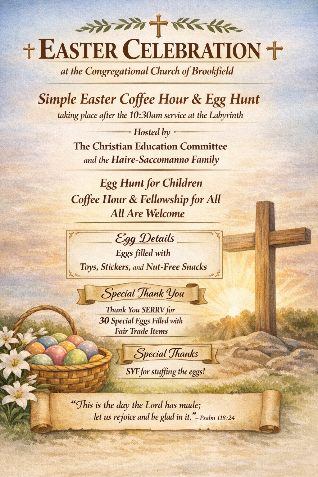 Keep an eye on your email, the Congregational Church of Brookfield Facebook Page, or our website on Sunday morning for the links to join us (and please feel free to share the links with family and friends). Afterward, if you are willing to share a photo of you or your family worshipping with us online that may be used on our CCB Facebook page or website, please send it to